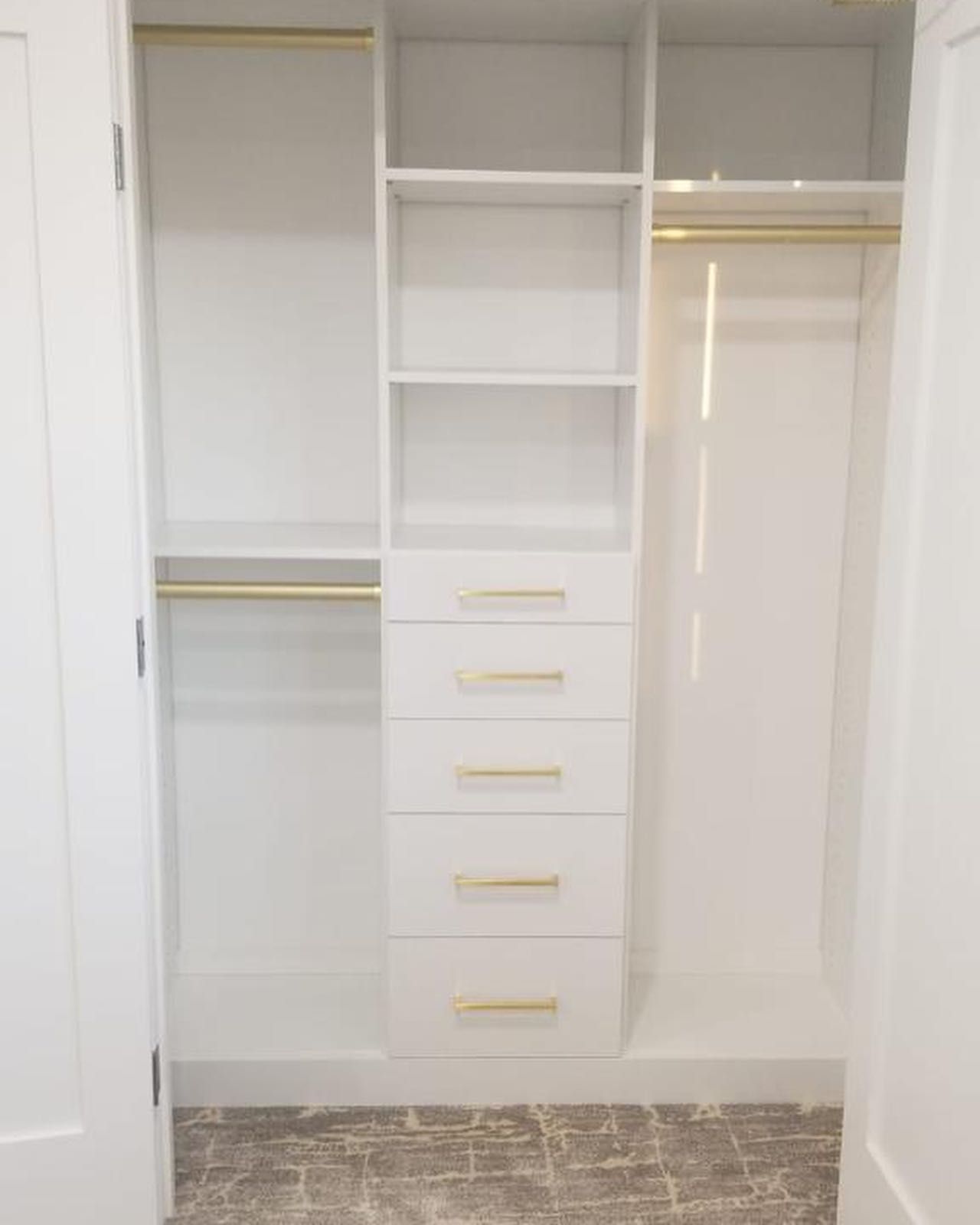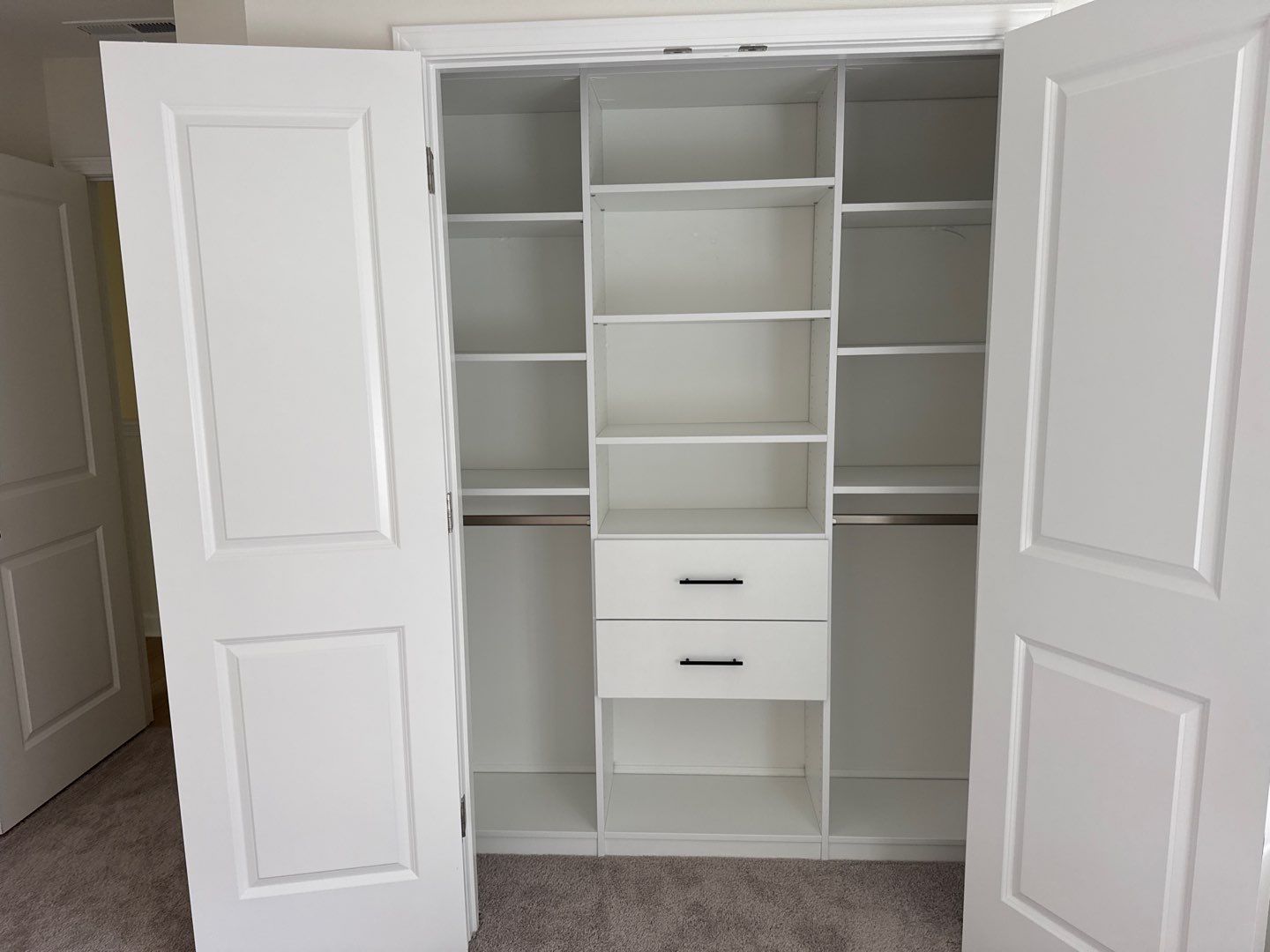 Our closets include adjustable shelving, smooth-glide drawers, dual hanging rods, and reinforced steel supports—designed for efficient organization and easy access.